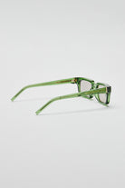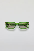 Its translucent green acetate brings depth and clarity to the frame, revealing internal structure while preserving a clean, disciplined form. The balance between sharp geometry and softened edges creates a confident presence that remains effortless in wear.